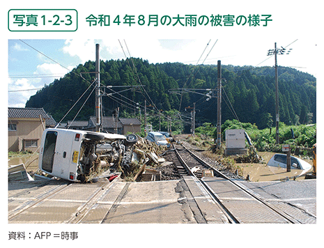 我が国では、高温が顕著だった6月下旬には東・西日本で、7月上旬には北日本で、1946年の統計開始以降、7月上旬として1位の記録的な高温となり、全国の熱中症救急搬送人員は、調査開始以降、6月は過去最高、7月は2番目に多くなりました。また、8月上旬には北海道地方や東北地方及び北陸地方を中心に記録的な大雨となり、3日から4日にかけては複数の地点で24時間降水量が観測史上1位の値を更新し、河川氾濫や土砂災害の被害が発生しました(写真1-2-3)。9月には台風第14号が非常に強い勢力で鹿児島市に上陸し、九州を中心に西日本で記録的な大雨や暴風となり、9月15日の降り始めからの総雨量は、九州や四国の複数地点で500ミリを超えるなど、9月1か月の平年値の2倍前後を観測、鹿児島県屋久島町で最大瞬間風速50.9メートルを観測したほか、複数地点で観測史上1位を更新しました。