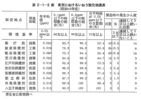 環境基準との適合状況をみると(第2-1-9表)、43年度は10か所ある測定点のうち都庁前、城東保健所、糀谷保健所、荒川保健所、都立衛生研究所の五つの測定点において環境基準を超過している。