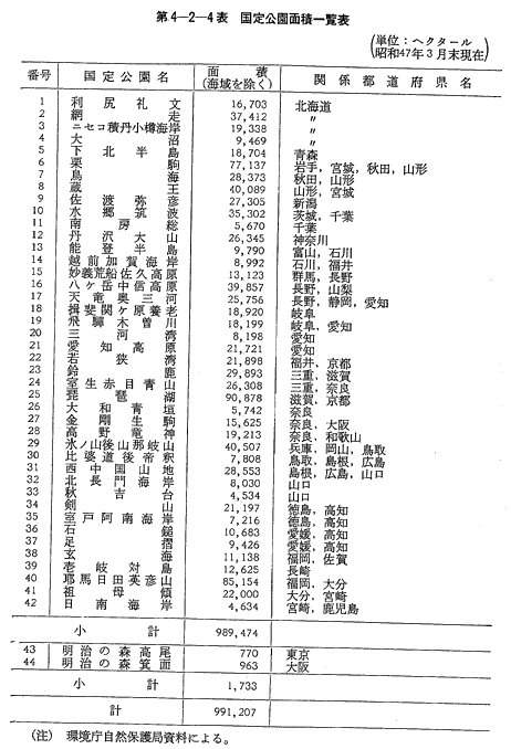 わが国の自然公園体系は、昭和6年の国立公園法制定以来、昭和32年の自然公園法制定を経て現在23の国立公園(国土面積の5.3%)、44の国定公園(国土面積の2.7%)、279の都道府県立自然公園(国土面積の5.5%)の設定へと発展し、その総面積は国土の総面積の13.5%を占め、国土の自然保護と野外レクリエーションの場として重要な役割をはたしている(第4-2-1図、第4-2-3表、第4-2-4表)。