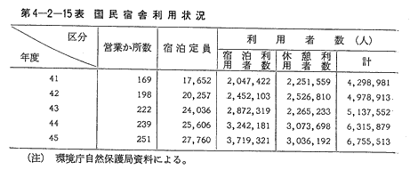 国民休暇村の利用者は、最近における都市の過密化、生活環境の悪化等を背景として、第4-2-18表のとおり、毎年、著しい増加がみられ、昭和45年度においては宿泊、休憩およびその他の野外レクリエーション施設の利用者を会せると約530万人にのぼっている。
