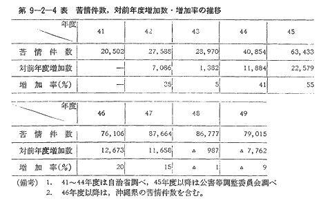 この苦情件数は、42年度から47年度までは引き続き増加を続けてきたが、48年度においてはわずか1%ではあるが始めて対前年度増加率がマイナスを示し、49年度においては更にこれが落込み、マイナス9%となった(第9-2-4表)。