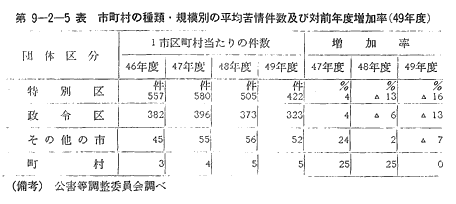49年度の対前年度増加率を市町村の種類別に見ると、特別区で16%、人口25万以上の市で13%、人口25万未満の市で7%それぞれ減少したが、町村では増減がなかった(第9-2-5表)。