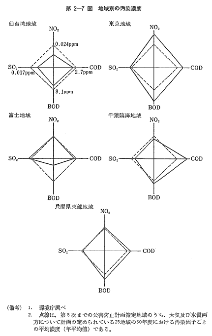 第2-7図は、大気及び水質両方について公害防止計画が策定されている第5次までの25地域(第2部第1章第3節152/sb2.1.3>参照)のうち50年度における汚染状況の典型的なパターンを表す地域の汚染状況を見たものである。