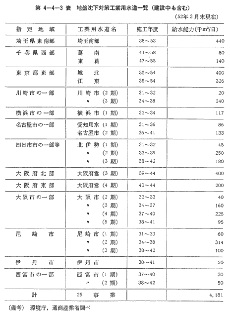 地下水採取量を抑制するための代替水対策としては、首都圏南部地域等において代替水供給事業が進められているが、特に工業用水道については「工業用水法」による規制に対応して建設される地盤沈下対策工業用水道事業に対して国庫補助金が交付され、その建設の促進が図られており、51年度には埼玉、千葉及び東京の各都県において5事業が引き続き実施された。51年度末における地盤沈下対策工業用水道事業の整備状況は、第4-4-3表に示すとおりである。