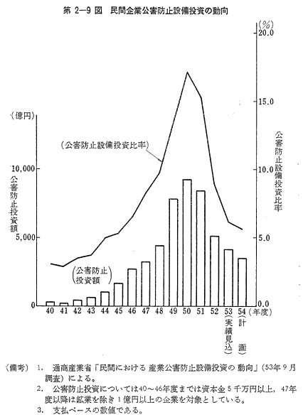 50年代に入ってからの民間企業の公害防止投資の減少は、その減少が急であったこととともに、ほとんどの業種において、また騒音・振動防止施設などは底固い動きを見せているものの、大気汚染防止施設、水質汚濁防止施設といった施設種類の別なく減少が見られていることが特徴である。このことは、我が国の民間企業が、40年代後半に急速に進展した公害規制に対し、必要な公害防止施設の設置をこの時期に集中して行った結果であると見られる。
