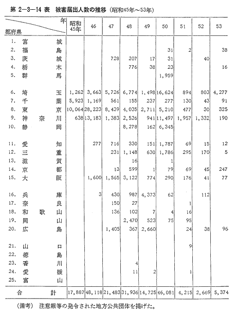 45年から53年までの光化学大気汚染によると思われる被害者の届出人数(自覚症状による自主的な届出による。)の推移(第2-3-14表)については、53年は5,374人で、52年の2倍であったが、45年〜52年の平均23,389人に比べると約4分の1となっている。その中で被害者届出人数全国計の80%が埼玉県に集中しており、更に、埼玉県におけるその半数以上(53%)は、警報発令日(7月4日、9月9日)に集中している。