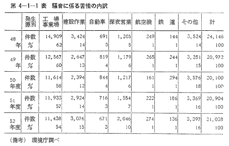 次に騒音の種類ごとに苦情件数の内訳を見ると、工場騒音が最も多く、建設騒音がそれに次いでいる(第4-1-1表)。