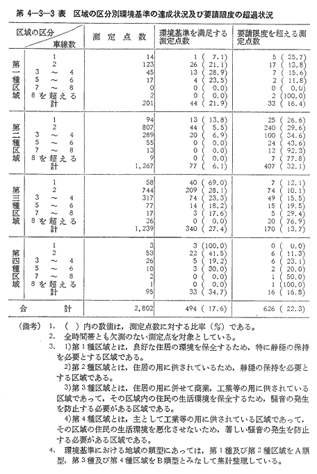 これを区域の区分別に見ると、住居の用に供されているため、静穏の保持を必要とする第2種区域において、特に騒音の程度が高く、1,267測定点中環境基準を満足する測定点は77点、6.1%にすぎず、逆に要請限度を超える測定点が407点、32.1%となっている(第4-3-3表)。