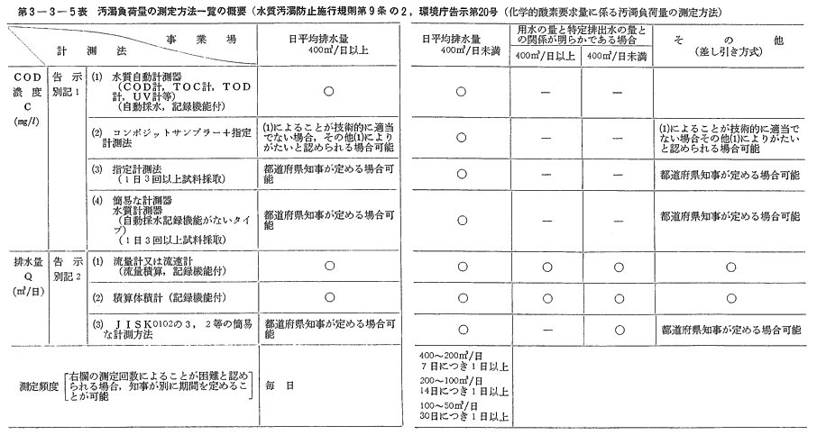 水質総量規制制度を的確に実施していくためには、汚濁負荷量の測定を確実に行うことが不可欠であり、「水質汚濁防止法」においては、総量規制基準が適用されている指定地域内事業場から排出水を排出する者は汚濁負荷量を測定し、その結果を記録することが義務付けられている。(第3-3-5表)
