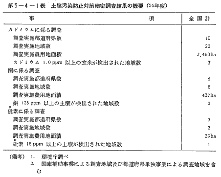 55年度においては、カドミウムに係る細密調査を10都県22地域、約2,460haについて、銅に係る細密調査を6府県8地域、約440haについて、また、砒素(ひ)に係る細密調査を3府県3地域、約40haについて実施した(この調査は国庫補助事業のほか、都道府県単独事業としても実施している。)。この調査の結果の概要は、第5-4-1表及び第5-4-2表に示すとおりである。