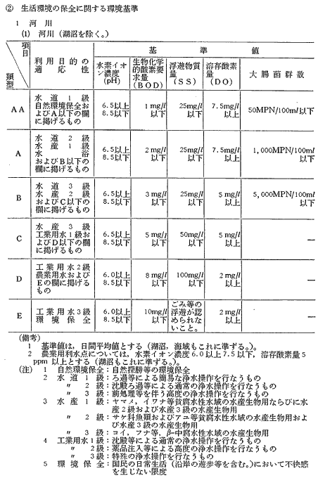水中の有機物などは、溶存酸素を消費することなどにより、水中生物の生育を阻害する。このような有機物などによる水質汚濁の指標として、現在BOD及びCODが採用されている。これらの有機汚濁指標は、いずれもmg/lで表され、数値が高いほど汚濁が著しいことを示す。