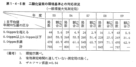 二酸化窒素については、環境基準との対応状況をみると、第1-4-6表のとおりであり、59年度では環境基準ゾーンの上限である0.06ppmを越えた測定局数の割合は、5.7%となっている。