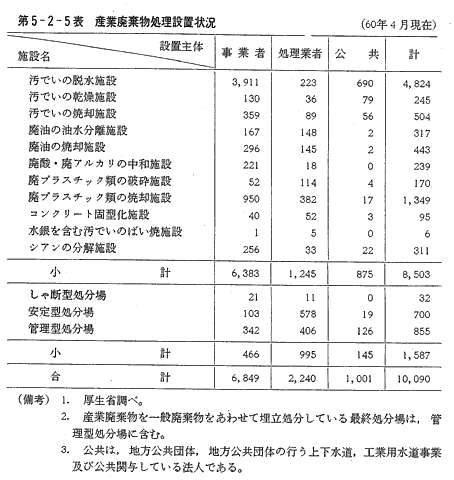 産業廃棄物の排出状況は第5-2-4表のとおりであり、59年4月現在の産業廃棄物処理施設の設置状況は第5-2-5表のとおりである。産業廃棄物処理業者の許可件数も年々増加しており、59年4月現在4万417件である。