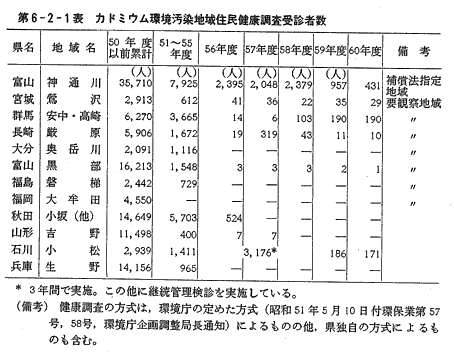 昭和43年の厚生省見解によると、カドミウムが「イタイイタイ病」の主因とされていることから、カドミウムによる健康被害発生の未然防止を図るため、カドミウム汚染地域において住民の健康調査を実施している(第6-2-1表)。