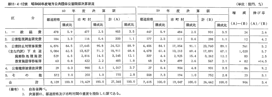 60年度において、地方公共団体が支出した公害対策経費(地方公営企業に係るものを含む。)は、2兆7,568億円(都道府県8,139億円、市町村1兆9,429億円)となっている。これを前年度と比べると、906億円(都道府県524億円、市町村382億円)3.4%の増となっている(第11-4-12表)。
