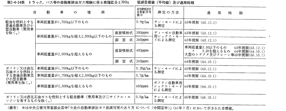 自動車から排出される窒素酸化物については、ガソリン・LPG車に対しては48年度から、ディーゼル車に対しては49年度からそれぞれ規制が開始された。その後、ガソリン・LPG乗用車については、53年度に47年10月の中央公害対策審議会の中間答申に示された当初目標値(窒素酸化物平均排出量0.25g/km)に沿った規制(53年度規制)が実施され、未規制時に比べ10分の1以下に削減されるという厳しい基準となっている。