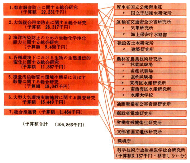 従来,環境問題に関連した調査研究は,各省庁においてその所管行政との関連において進められてきましたが,環境庁の設置に伴い環境庁では,環境保全施策の総合的推進という観点から,各省庁で実施する公害の防止ならびに自然環境の保護および整備に関する経費の見積り方針の調整を行なうとともに,とくに試験研究については,効率的な総合調整を行なうため各省庁の試験研究費を一括計上し,予算成立後各省庁に配分し,移し替えることになりました。