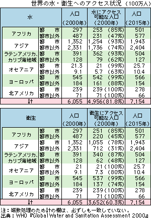 3 地球規模での社会、経済との関わりからみた環境の状況地球規模での環境に対する負荷の増大は、社会、経済と複雑に関わり合っています。 例えば、経済のグローバル化は、環境に配慮した製品や技術の普及などを世界各国にもたらす一方、国際間の物流移動に伴うエネルギーの増大や有害廃棄物の越境問題を発生させるおそれなどももたらします。また、開発途上国における過耕作、過放牧、森林の再生能力を超えた伐採等による環境劣化は、十分な資源や食料の確保を困難にし、貧困に拍車をかけるばかりでなく、紛争の原因になったり、環境難民の発生をもたらしたりすることにもなります。 人口増加と水問題の関係を見てみると、国連「世界水発展報告書」によると、人口増加に伴い、水需要が増加し一人当たり水供給量が明らかに減少しているとされていますが、途上国における人口増加と貧困を背景とした都市への人口集中が問題をより深刻なものとしており、都市では約1億7千万人、地方では約9億2千万人もの人々が安全な水供給を受けることができない状況にあります。安全な水が供給されず健康が損なわれると、生産性の低下、所得の減少をまねき貧困につながります。2015年(平成27年)までに世界人口は、約11億人増加し、その88%が都市に居住するようになると予測されており、特に都市における水供給体制の整備が必要になるとされています。 環境、社会、経済が複雑に関わっている中で人類が生存していくには、地球の有限性を考えて社会経済システムに環境配慮を織り込む必要がありますが、人々の資源消費と自然の生産能力とを比較したWWF(World Wide Fund for Nature 世界自然保護基金)の試算によれば、世界全体の人々の資源消費は既に1970年代に自然の生産能力を上回っているとされています。これを踏まえると、日本人が地球の環境容量の中で生活するには、現在の資源消費量を半分以下にする必要があります。私たちは、持続可能な社会の構築に向けて実効ある取組を着実に進めていくことが必要です。 |