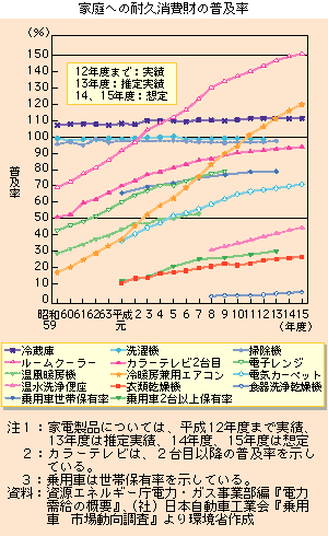 1 日本の戦後における社会経済と環境問題の変遷戦後の経済復興を優先した昭和30~40年代、生産活動の拡大、所得の増加に伴い、電気洗濯機、電気冷蔵庫、白黒テレビの「三種の神器」など、さまざまな製品が日常生活へと普及しました。こうした中、公害問題による被害地域が日本全国に広がるとともに、身近な自然の破壊、干潟や浅瀬の埋め立てなど、自然破壊が全国的な規模で進行しました。 経済が安定成長へと移行した昭和50年代、単身世帯の増加、女性の社会進出に伴い、外食やレトルト食品等の加工食品が増加し、宅配等の新たなサービスも登場しました。この時期、二度にわたる石油危機等を背景とし、省エネルギー化が進んだにもかかわらず、通常の事業活動や日常生活に伴う環境負荷が増大し、都市・生活型公害が顕在化しました。 バブル経済期の昭和60年代以降、テレビや乗用車など一家に2台目以上の耐久消費財、余暇やレジャーといったサービス分野の支出が大きな伸びを見せています。また、経済活動のグローバル化とともに大量生産・大量消費・大量廃棄型の社会経済システムが地球規模で拡大を見せ、地球環境問題が顕在化してきました。 |
