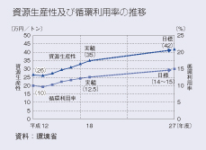 わが国の経済社会における物質の流れを見ると、入口の指標である資源生産性は平成18年度で約35万円/トンであり、いわゆる循環型社会元年である平成12年度と比べ約33%上昇し改善しています。また、わが国に投入された物質のうち、循環利用されている割合を示す循環利用率は、平成18年度で約12.5%となり、平成12年度と比べ約2.6ポイント上昇しました。また、1人1日当たりのごみ排出量は、平成18年度に1,116グラムで、平成12年度比5.8%の削減となっています。わが国の最終処分量は、平成18年度で約29百万トンであり、平成12年度と比べ約49%減少しました。