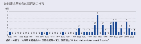 国境を越えた環境問題がますます大きくなる中で、国際社会でも、地球環境に係る問題への取組が進んでいます。環境関連条約の発効数は近年増大しており、その分野も多様になってきています。