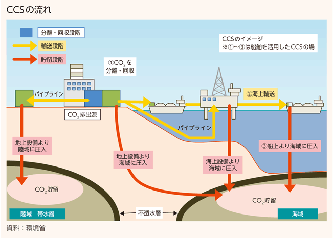 CCSは「環境エネルギー技術革新計画」において、地球全体の環境・エネルギー問題の解決と、各国の経済成長に必要と考えられる「革新的技術」の一つとして位置づけられるとともに、「日本再興戦略」のロードマップにおいて、CCSの実用化・普及促進に向けた工程が示されており、平成32年頃の実用化を目指して、平成24年度から北海道苫小牧沖で実証実験を行っています。