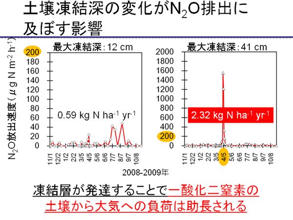 | 我が国を代表する畑作地帯である北海道・道東地方は、近年、土壌凍結深が顕著に減少する傾向にあります。土壌凍結深の変化が地球環境や農業生産に与える影響を調査するため、主要な温室効果ガスの一つである亜酸化窒素(N2O)の農地からの放出量と融雪水の土壌への浸透量を測定した結果、土壌凍結深が増えるほどN2Oの大気への放出量が増加し、融雪水の浸透量が減少することが明らかになりました。一方、道東地方の農家は土壌凍結を抑制する雪を除雪することで人工的に凍結を促進させ、雑草(野良イモ)を防除する処理を行っています。 本研究では、N2Oの大気への放出量や融雪水の浸透量、野良イモの致死率等と土壌凍結深との関係を明らかにし、環境にやさしく、農業生産を保障する、最適な土壌凍結深を見つけ出すことを目的にしています。同時に、地温推定モデルを用いて最適な土壌凍結深になる除雪のタイミングを割り出す手法を確立することで、まったく新しい冬の農地管理技術の開発を目指します。 |