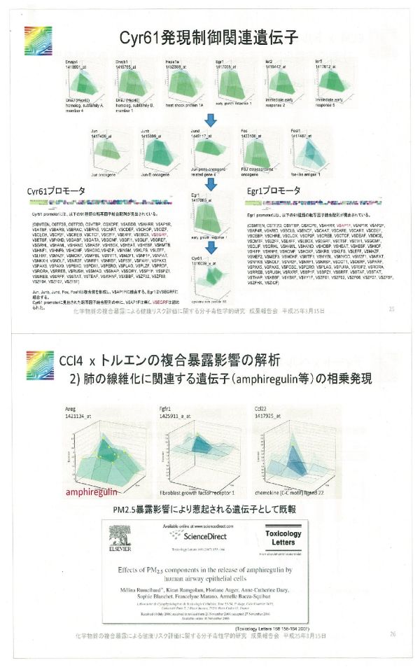 | 環境中の化学物質のリスク評価・管理では、複合暴露を常に考慮する必要がありますが、現状では個々の化学物質を別個に評価する事にほぼ限られています。その最大の理由は、現行法では物質Aと物質Bを同時に暴露した途端、新たな物質Cを評価する事と同じになるためです。即ち、厖大な組み合わせを処理すると言う問題に直面します。この問題に対し、我々の推進する毒性分子メカニズム解析手法により、物質 A の遺伝子発現情報と物質 B の遺伝子発現情報から、AとBの複合暴露時における毒性を予測する方法が原理的に開発可能である事を提案します。これにより複合影響の評価法が開発され、国民の安全な生活の確保に貢献することが期待されます。 | |||