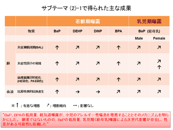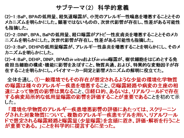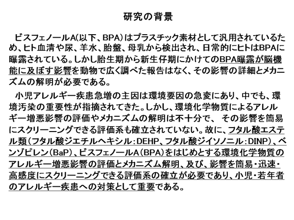 | 環境中の化学物質が小児の発達段階における神経系と免疫系に及ぼす影響とそのメカニズムを実験的に解明することによって、環境化学物質の小児発育への影響を明らかにするために実施されているエコチル調査を連携・補完することを目的として以下の研究を行う。 | |||