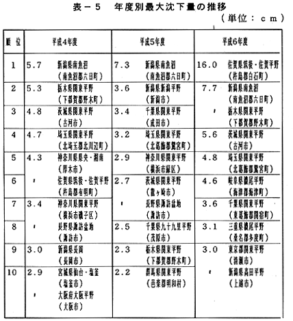 | (1)全国 ・年間2cm以上の地盤沈下地域の面積 平成8年度 13地域 258km2 (平成7年度 14地域 21km2) ・うち年間4cm以上の地盤沈下地域の面積 平成8年度 4地域 22km2 (平成7年度 2地域 1km2未満) ・沈下体積(沈下面積と沈下量の積) 平成8年度 2,318万m3(東京ドーム約20杯分)、平成7年度の約2倍 (2)主な地盤沈下地域 ・関東平野(茨城県、栃木県、群馬県、埼玉県、千葉県) 年間最大沈下量 6.9cm(栃木県、全国第1位) 年間2cm以上の沈下面積 252km2(全国の約95%) ・筑後・佐賀平野(佐賀県) 年間最大沈下量 2.4cm(全国第6位) 5カ年累計沈下量 20cm(全国第3位) ・南魚沼(新潟県) 年間最大沈下量 5.6cm(全国第2位) 5カ年累計沈下量 30cm(全国第1位) |
