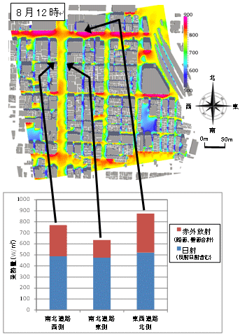 真夏の正午(気温約33℃)に街路で歩行者が受ける正味の放射熱量(受熱量:別紙2)を計算(※)しました。幅の広い南北道路では600~800W/m2、幅の広い東西道路の北側歩道では900W/m2近くになりました。