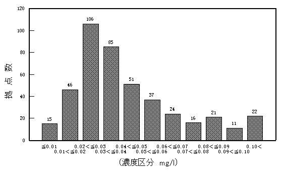 - トリハロメタン生成能は、現在のところ評価を行うことができない(注)が、トリハロメタン生成能の分布状況をみると、地点数評価で0.02mg/lを超え0.03mg/l以下の範囲のものが全体のうち106地点(24.4%)と最も多くを占めている。