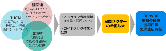 本プロジェクトは、国際自然保護連合(IUCN)、経団連自然保護協議会(KNCC)及び環境省による連携体制の下、各組織の専門性とネットワークを相互に活用し、日本国内に加え、アジア地域を中心とした世界各国の優良なOECMを通じた生物多様性保全への貢献事例を世界へと発信し、民間セクターのOECMへの参画を促進し、生物多様性保全に関する世界目標達成に貢献することを目指します。