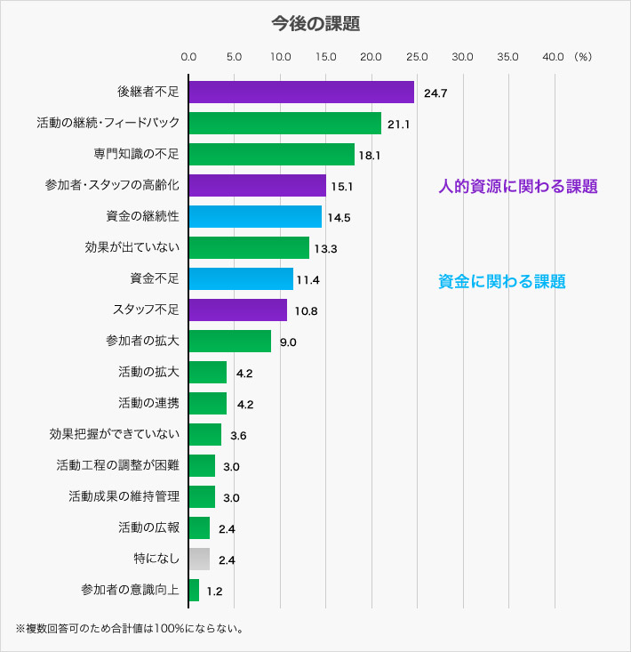里海づくり活動の主体が懸念する課題は、「スタッフや参加者の高齢化・後継者」「活動資金・資金の継続性」等、人にかかわる課題、資金等継続性に関する課題が多くあげられている。