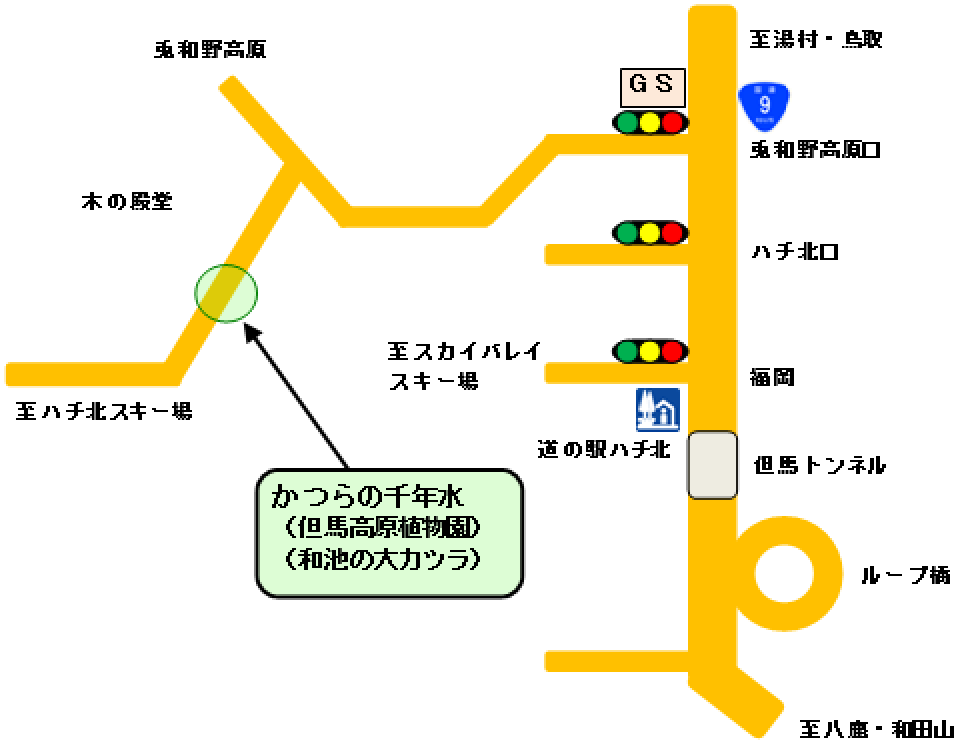 - 山陰本線八鹿駅 → 全但バス(村岡、秋岡、湯村温泉方面) → ハチ北口下車 → タクシーで約10分