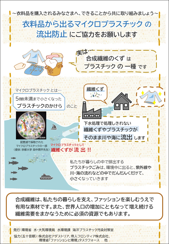 環境省では、関連する企業や団体の皆様と協力して、マイクロプラチックの発生抑制・流出抑制対策に関する以下の一般向けのリーフレットを作成しました。