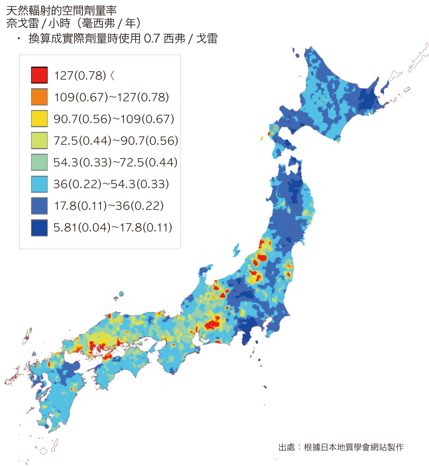 人們知道,由於大地的土壤及岩石的差異等,輻射劑量因地區而有所不同。